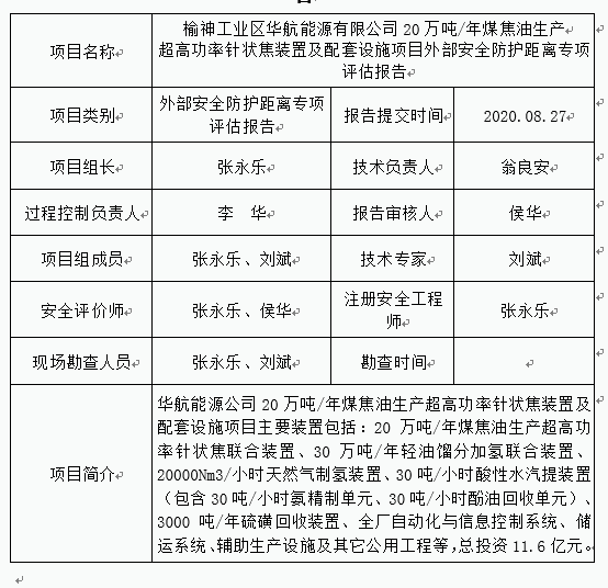2020.08.28榆神工业区华航能源有限公司20万吨/年煤焦油生产 超高功率针状焦装置及配套设施项目外部安全防护距离专项评估报告