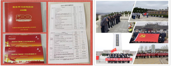 中国环保党委深入贯彻落实集团公司党委部署要求,组织各基层党组织积极做好再部署、再动员,采取多种形式,掀起学习热潮,高标准推进党史学习教育落实落地。一是把规定动作做实。下属栖霞公司党支部通过开展“四个一”系列活动,列明9项规定动作,推动党史学习教育走深走实。涞水公司党支部制定“一月一专题”学习计划表,将12个研讨专题逐月推进,沧州公司党支部开展每日一读、每周一课、每月一测的“1+1+1”党史学习教育;萍乡公司党支部采取“参观见学、领导带学、视频看学、网络助学、结队帮学”五学模式,抓好基层党员党史学习教育。二是把自选动作做活。保定公司党支部推出每周红色观影、“党史百年”诗词朗诵、红歌合唱等活动;山东公司党支部依托当地红色教育资源,组织开展实践教学活动,烟台公司和润达公司党支部联合开展“忆党史、铭党恩、促党建”跟着视频学党史活动;合肥公司党支部组织开展“学党史励初心 开奋斗新征程”党史知识竞赛,教育引导广大党员学透历史、学深思想、学出成效。三是把各环节工作做精。公司党委紧密结合方案要求,为领导班子成员和各基层党组织“量身定制”《党史学习教育工作任务落实卡》,以项目化、清单化、责任化的方式,既明确“规定动作”内容,又为“自选动作”指明方向。同时编印《党史学习应知应会100题》口袋手册,以知识题库的形式分享党史知识,推动党史学习教育精细化、规范化。